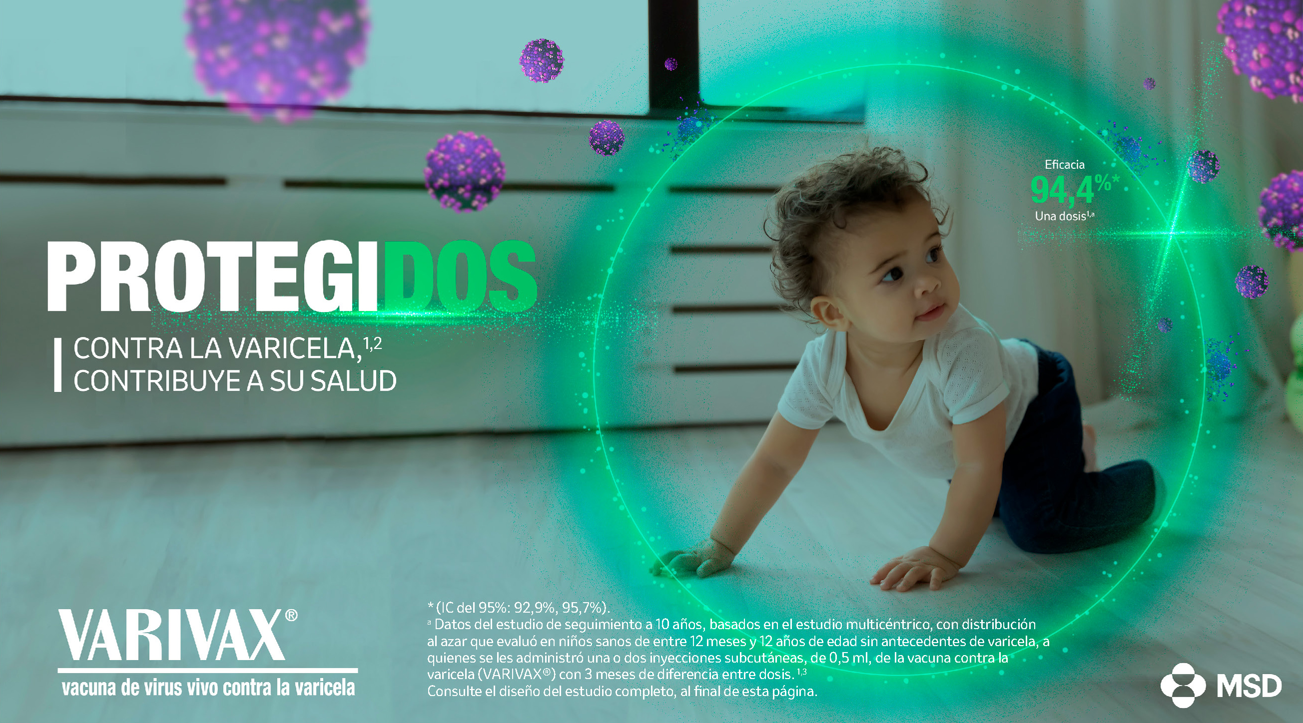 Referencias: 1. Kuter B, Matthews H, Shinefield H, y cols.Ten years follow-up of healthy children who received one or two injections of varicella vaccine. Pediatr Infect Dis J. 2004; 23(2):132-7. 2. Información para prescribir de VARIVAX® (Vacuna de virus vivo contra la varicela). 3. Ngai AL, Staehle BO, Kuter BJ, y cols. Safety and immunogenicity of one vs. two injections of Oka/Merck varicella vaccine in healthy children. Pediatr Infect Dis J. 1996; 15(1):49-54. 4. Arlant LHF, Garcia MCP, Avila Aguero ML, Cashat M, y cols. Burden of varicella in Latin America and the Caribbean: findings from a systematic literature review. BMC Public Health. 2019; 19(1):528.