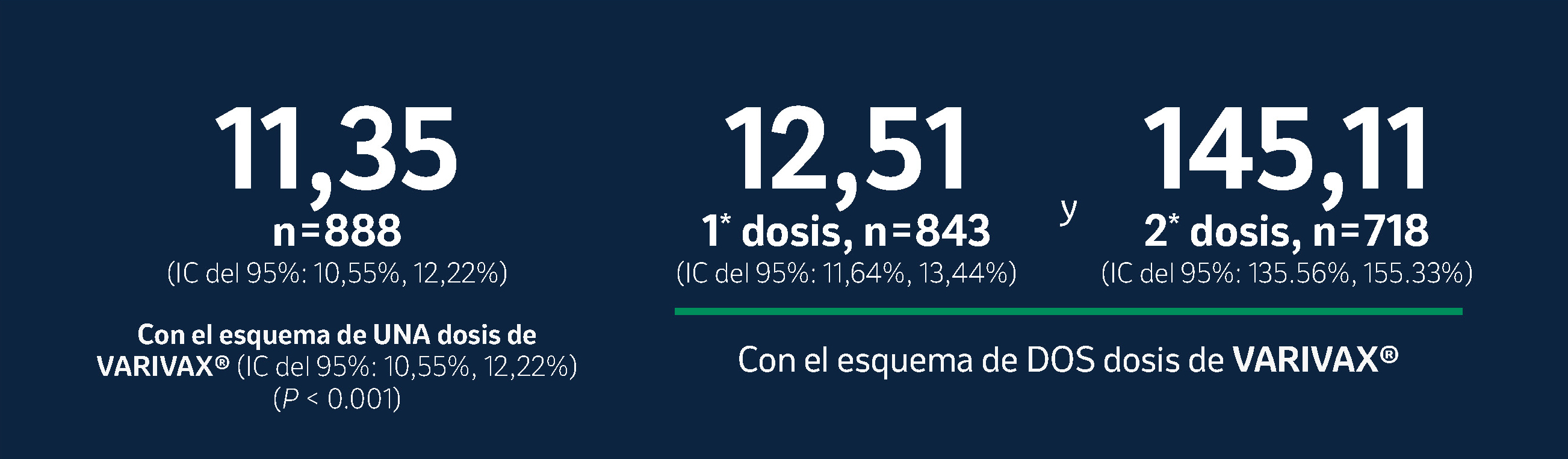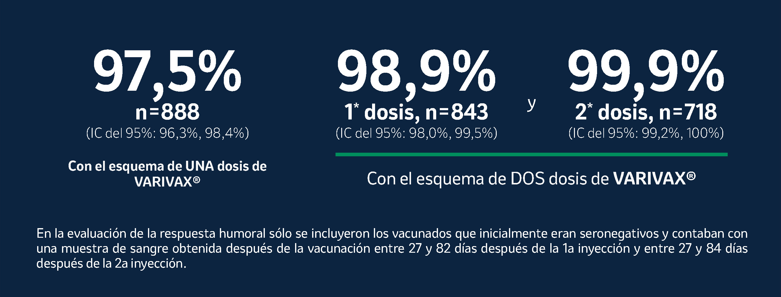 En un estudio clínico realizado en 2.196 niños sanos desde 12 meses a 12 años de edad sin antecedentes de varicela o herpes zóster; en el que se comparó la tolerabilidad e inmunogenicidad de 1 vs. 2 dosis de VARIVAX®, se encontró que:1* Las tasas de seroconversión logradas con VARIVAX®, a las 6 semanas post-vacunación, conforme al esquema prediseñado, con una o dos dosis fueron de:1
