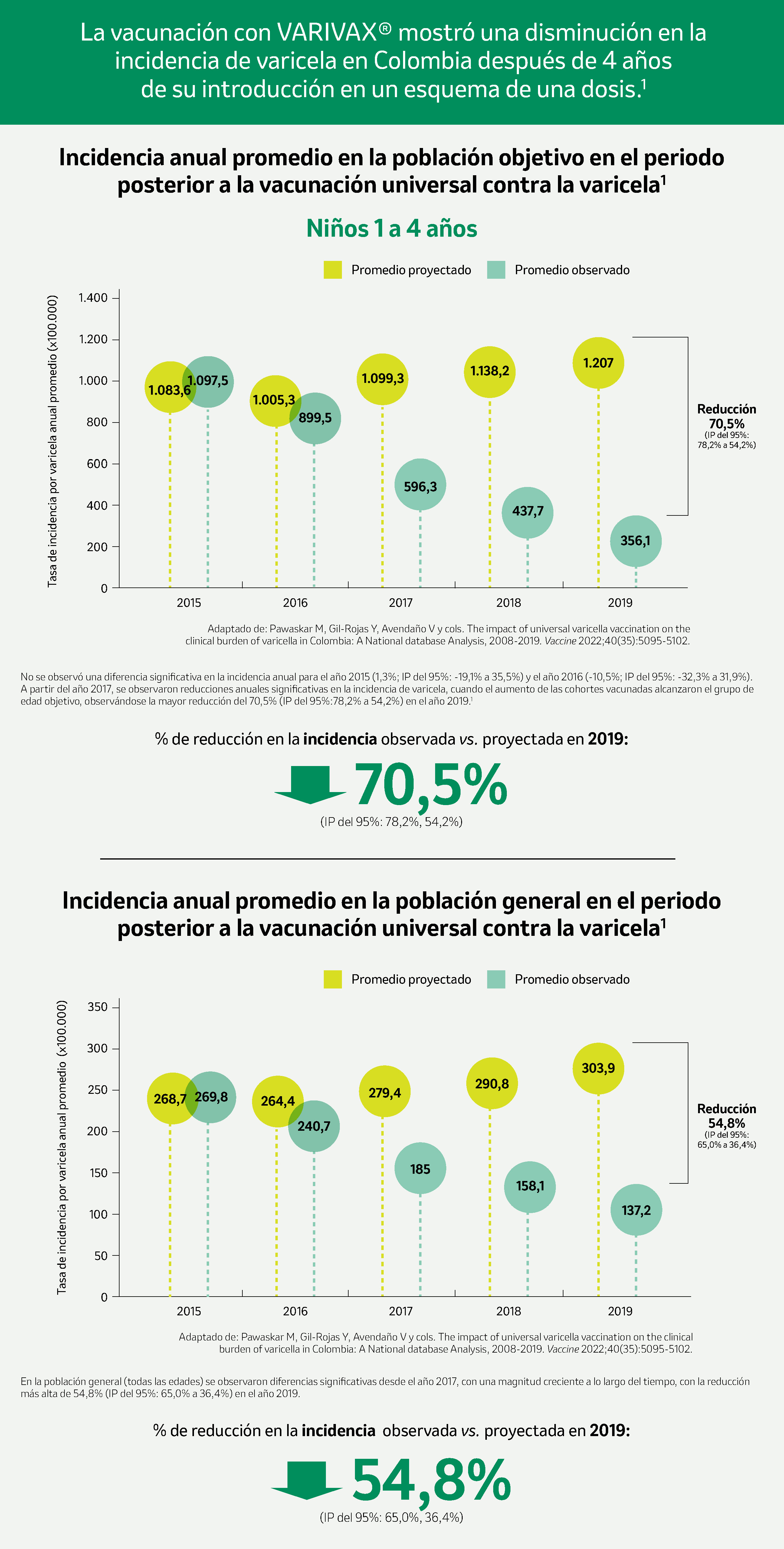 Referencias: 1. Pawaskar M, Gil-Rojas Y, Avendaño V y cols. The impact of universal varicella vaccination on the clinical burden of varicella in Colombia: A National database Analysis, 2008-2019. Vaccines. 2022;40(35):5095-5102.